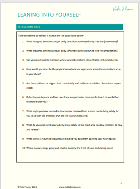 Leaning Into Yourself offers space for you to connect to your chest area. The course below allows you to stop and take time to move and lean in to what your chest is holding and creates space to open your heart. Follow each step in your own time and reflect on what stories come up for you.